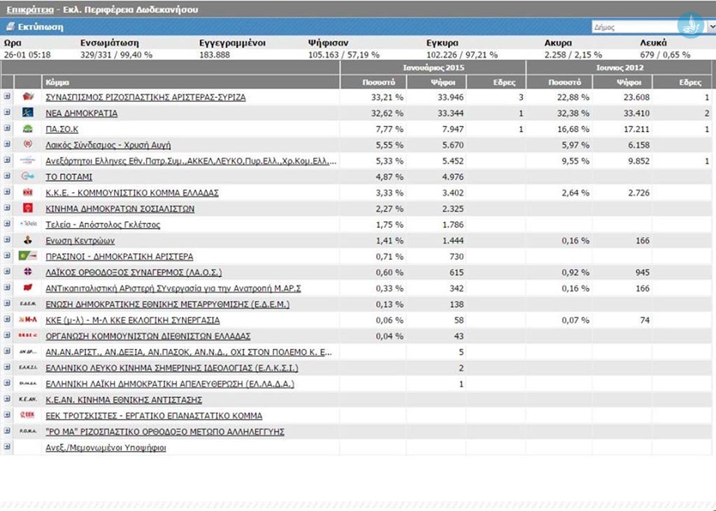 “κλειδώσει” το 4-1 ( ΣΥΡΙΖΑ 4 ΝΔ 1) το ΠΑΣΟΚ φαίνεται να εξασφαλίζει μια έδρα στα Δωδεκάνησα.‘ Ετσι ο ΣΥΡΙΖΑ έχει στα Δωδεκάνησα 3 έδρες, η ΝΔ 1 έδρα και το ΠΑΣΟΚ 1 έδρα